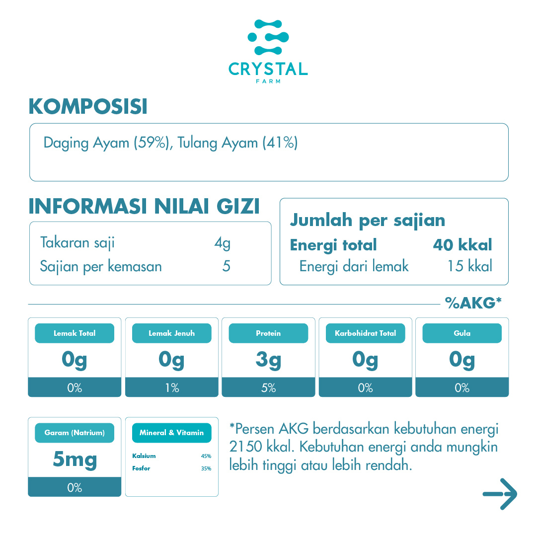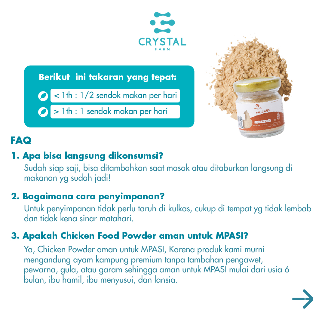 Produk kami sudah mendapatkan BPOM certified (sertifikasi BPOM) sehingga dijamin aman untuk digunakan. Chicken Powder dari Crystal Farm terbuat dari 100% ayam kampung.