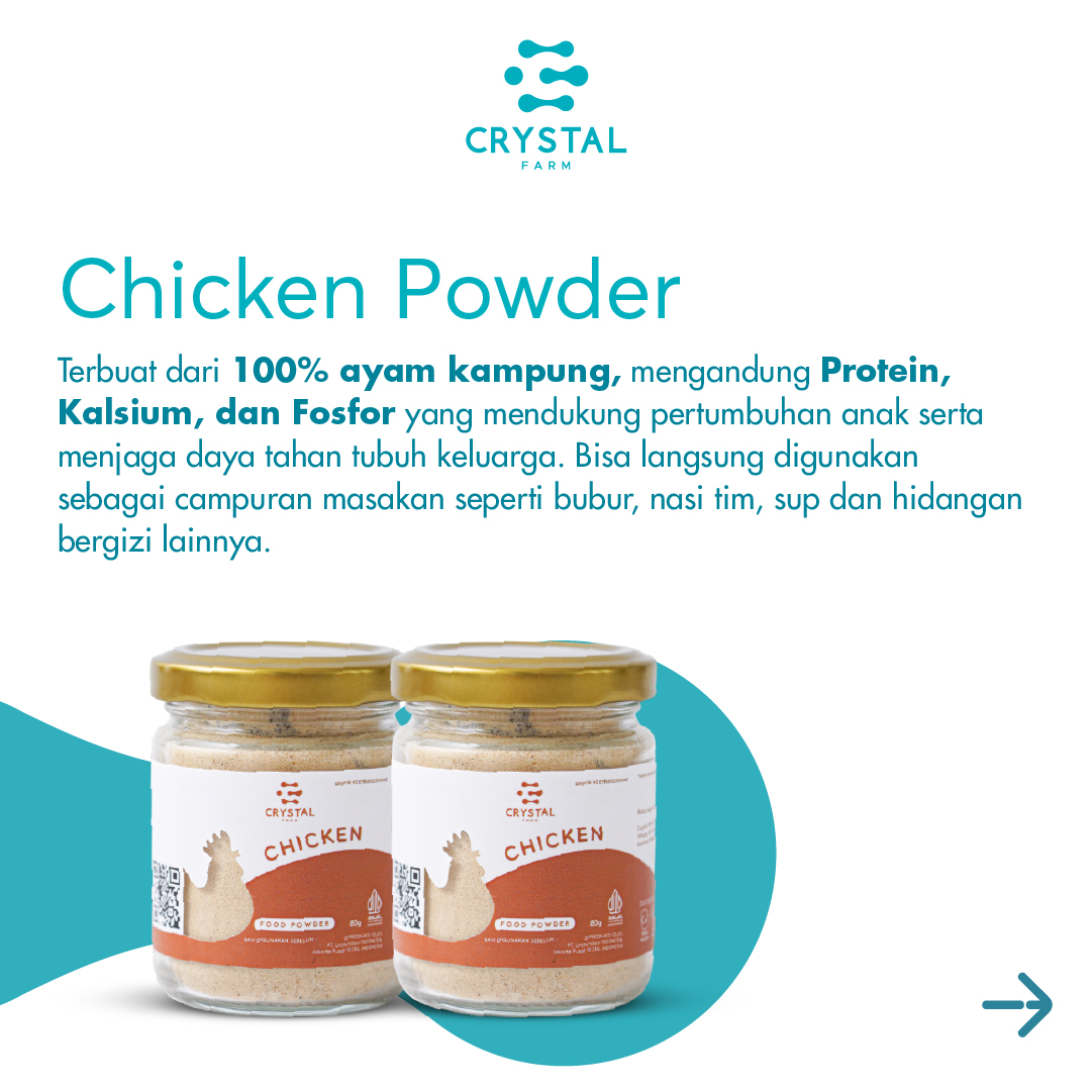 Produk kami sudah mendapatkan BPOM certified (sertifikasi BPOM) sehingga dijamin aman untuk digunakan. Chicken Powder dari Crystal Farm terbuat dari 100% ayam kampung.
